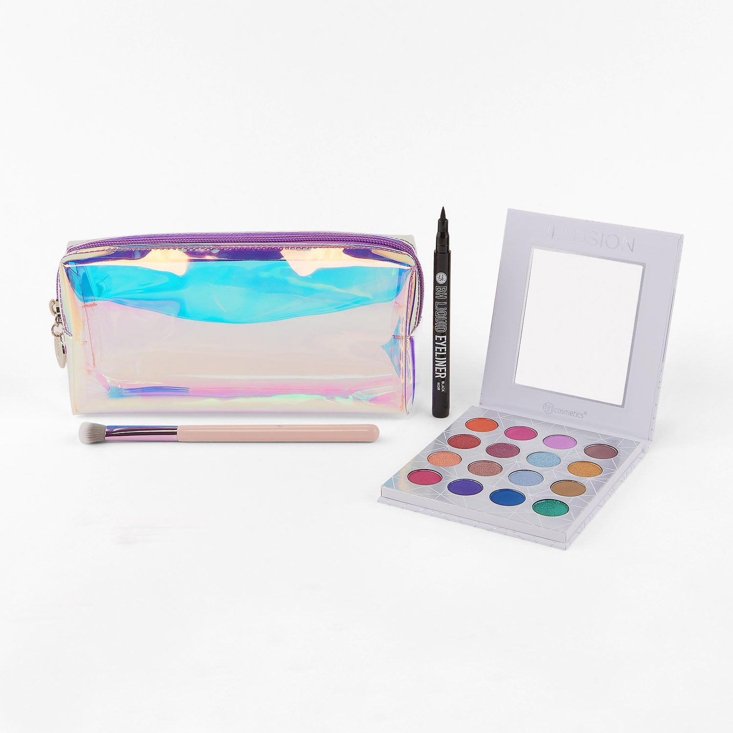 Bask in the aura of enchantment with our Opallusion: Mystic set, the perfect trio of BH products for radiant eye looks. This handbag essential includes the Illusion – 16 Color Shadow Palette, a seductive spectrum of dazzling gemstone shades, rich neutrals and entrancingly glam pastels with vibrant color payoff. Apply these velvety mattes and reflective shimmers with the ultra-soft shader brush for instant impact, and complete the look with BH Liquid Eyeliner in Black for bold eye effects. It all comes in a chic holographic bag for luxe looks at your fingertips.