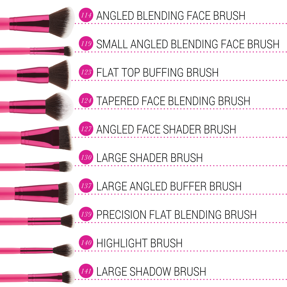 Apply makeup expertly with our Sculpt and Blend Fan Faves 10 Piece Brush Set, the ultimate collection of face and eye brushes for shading, contouring and highlighting. You asked for it, you got it! This versatile selection in distinctive magenta, which adds a bright burst of color to your makeup table features your favorite, best-of-the-best brushes from BHs 3 popular Sculpt and Blend sets. The fluffy synthetic bristles are firm enough for precise color placement, yet flexible enough for seamless blending, and work with liquids, creams and powders. This multipurpose mix of efficient, easy-to-use beauty tools can be used for everything from defining cheekbones and jawline to whisking on bronzer and blush to intensifying shadow and illuminating brow bones.